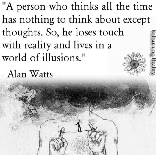 Moving on, this dialogue occurred in the comments section of this post which was put up on April 18, 2019. I took a look at the saying and that song just popped into my head, of course. Then I noticed in the comments how many people seemed to be struggling with the point Watts was meaning to put across through the quote. I saw multiple comments asking “how can you stop thinking” or “you can’t stop thinking, it’s impossible, I don’t get this, it’s bull” (not exactly, but basically).