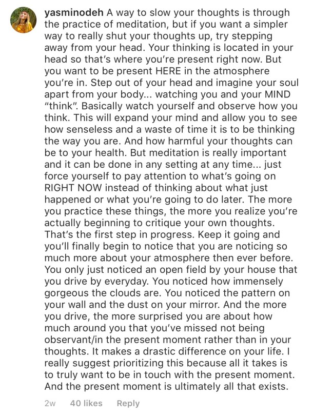 “A way to slow your thoughts is through the practice of meditation, but if you want a simpler way to really shut your thoughts up, try stepping away from your head. Your thinking is located in your head so that’s where you’re present right now. But you want to be present HERE in the atmosphere you’re in. Step out of your head and imagine your soul apart from your body… watching you and your MIND “think”. Basically watch yourself and observe how you think. This will expand your mind and allow you to see how senseless and a waste of time it is to be thinking the way you are. And how harmful your thoughts can be to your health. But meditation is really important and it can be done in any setting at any time… just force yourself to pay attention to what’s going on RIGHT NOW instead of thinking about what just happened or what you’re going to do later. The more you practice these things, the more you realize you’re actually beginning to critique your own thoughts. That’s the first step in progress. Keep it going and you’ll finally begin to notice that you are noticing so much more about your atmosphere than ever before. You only just noticed an open field by your house that you drive by everyday. You noticed how immensely gorgeous the clouds are. You noticed the pattern on your wall and the dust on your mirror. And the more you drive, the more surprised you are about how much around you that you’ve missed not being observant/in the present moment rather than in your thoughts. It makes a drastic difference on your life. I really suggest prioritizing this because all it takes is to truly want to be in touch with the present moment. And the present moment is ultimately all that exists.”