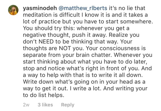 This is a step in progress because you’re able to step away from your thoughts and notice them. You’re able to make inferences regarding them. You’re understanding that thoughts like these are useless, a waste of space and energy in your head, and detrimental to yourself.