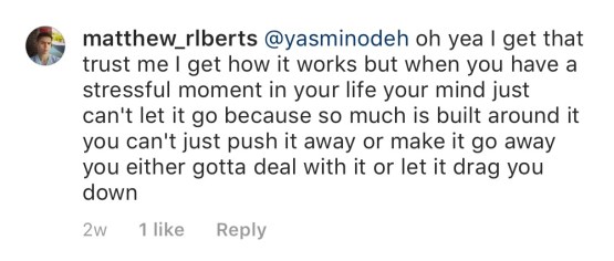 “Yes yes true (this is my reply to your last comment) I can relate and with that, you’ve gotta take baby steps to solutions. Maybe write down possible solutions to one problem you’re dealing with, choose your best option, keep it in your head and slowly begin working towards it. Let’s say your parents treat you like shit, for example, and you don’t how to change that. And that’s one difficult thing is changing people around you, especially ones you can’t just drop like you can with bad friends. A solution would be to move out. Another solution would be to deal with it or change yourself for them. And you decide your best option is to move out. Then you put that in your head and the baby steps begin trickling in like: 1. You need to get a job or a better paying one in order to afford a place. So you start looking and trust me, if you REALLY want a good paying job, you WILL find one because you’ll do what it takes, even if it’s applying to jobs 20 times a day because that can be what it takes. And you go from there and eventually find yourself moved out and moving on. Continue to keep your desires in the tip of your mind and you’ll continue to achieve in the same way.”